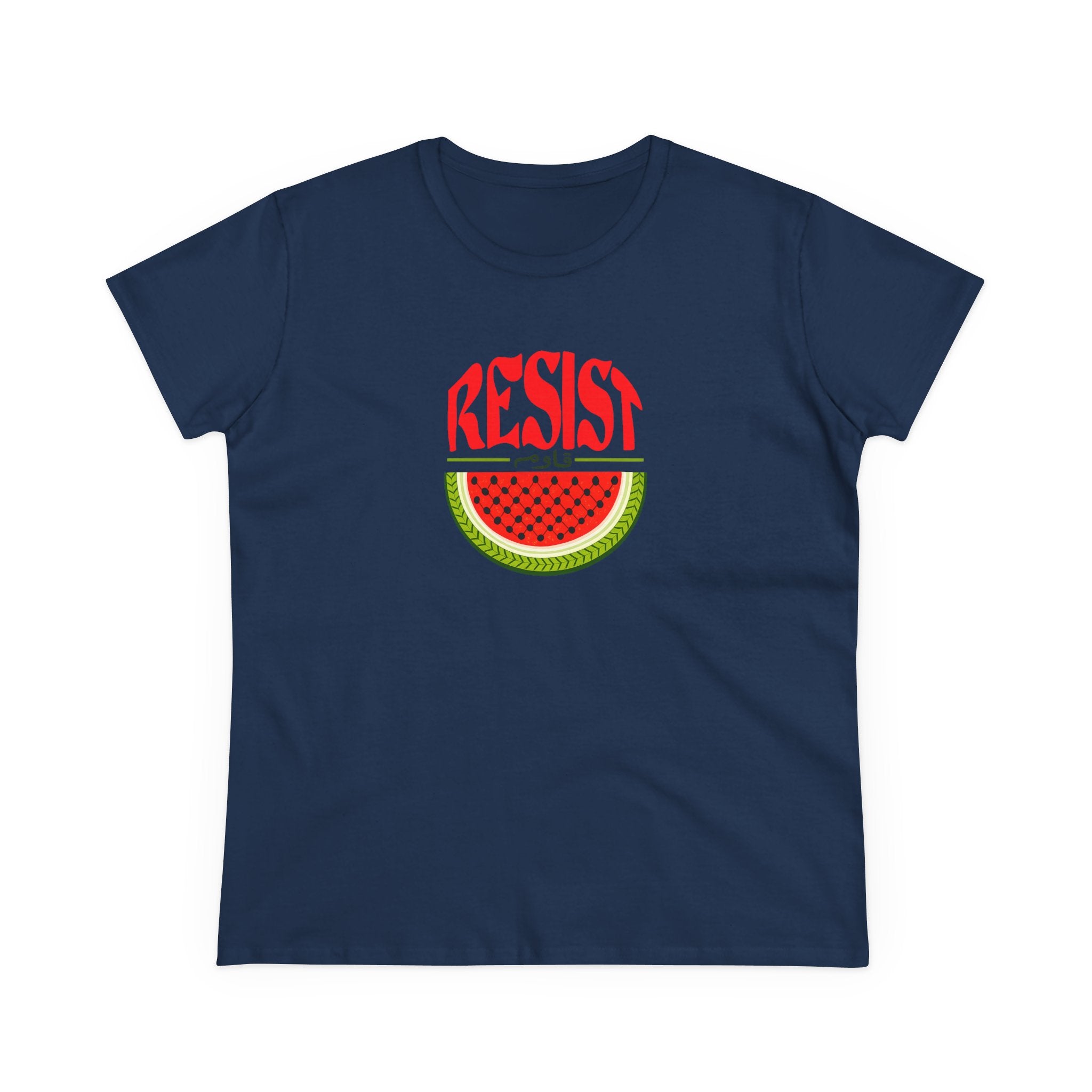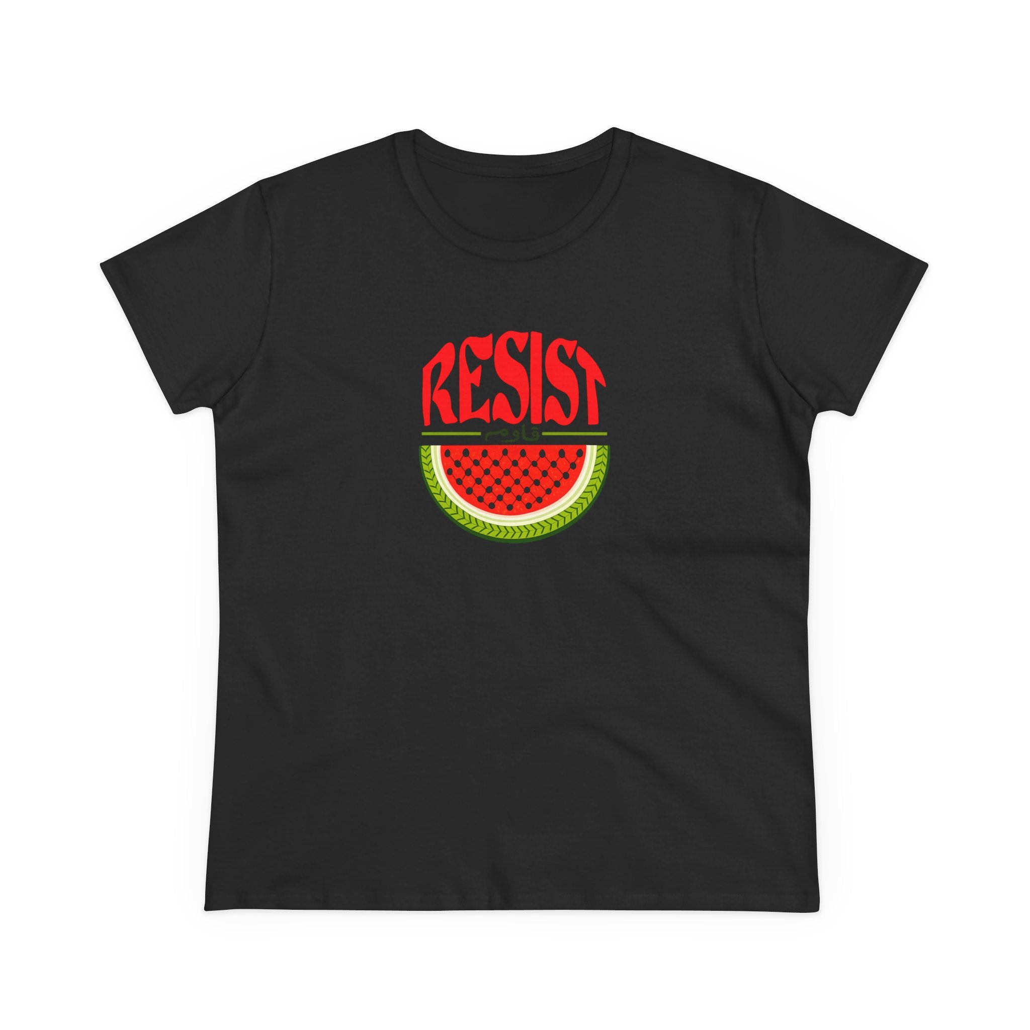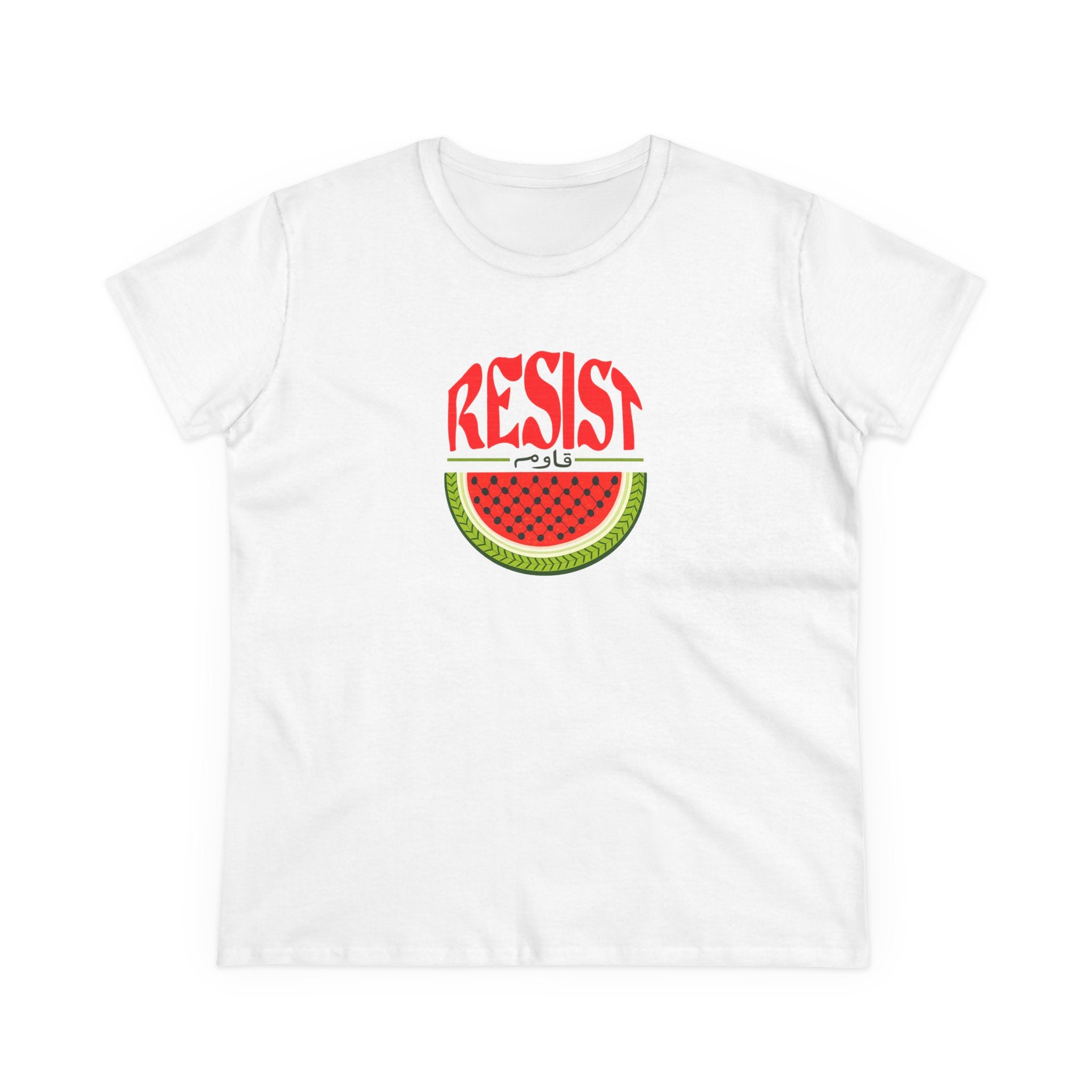 Make a bold statement of resistance and solidarity with our Women’s Watermelon Resist T-Shirt. Featuring a striking watermelon design with the word “RESIST” above it, this shirt symbolizes Palestinian resilience and identity. The watermelon has become a powerful cultural icon representing the Palestinian flag and freedom — making this tee both meaningful and stylish.