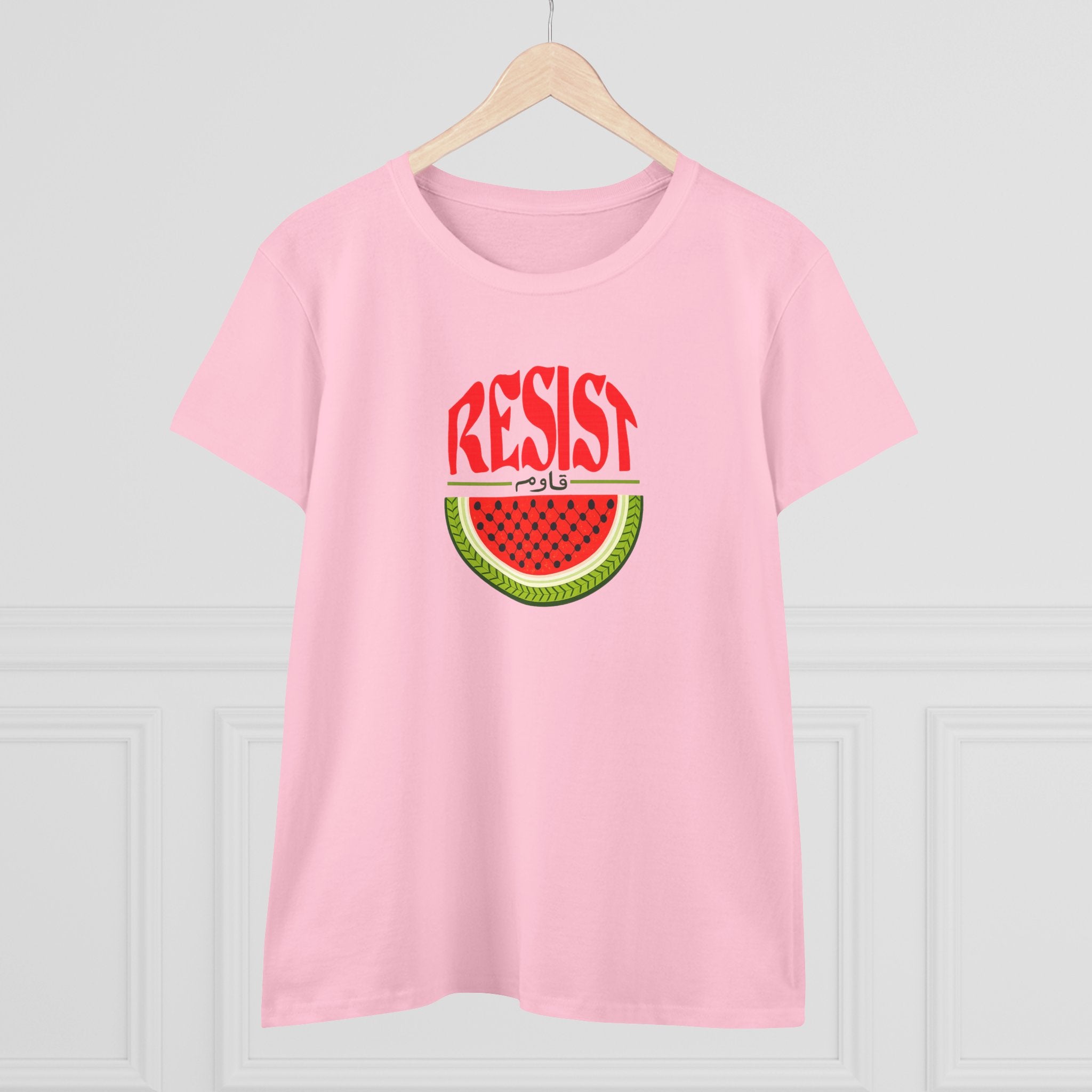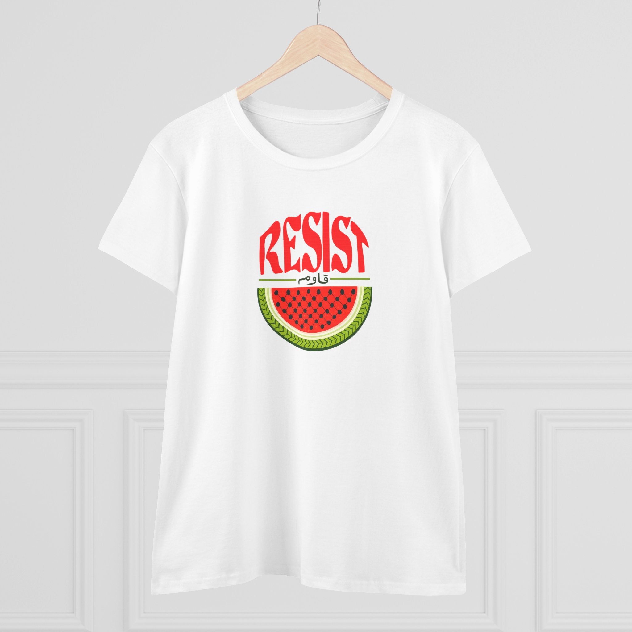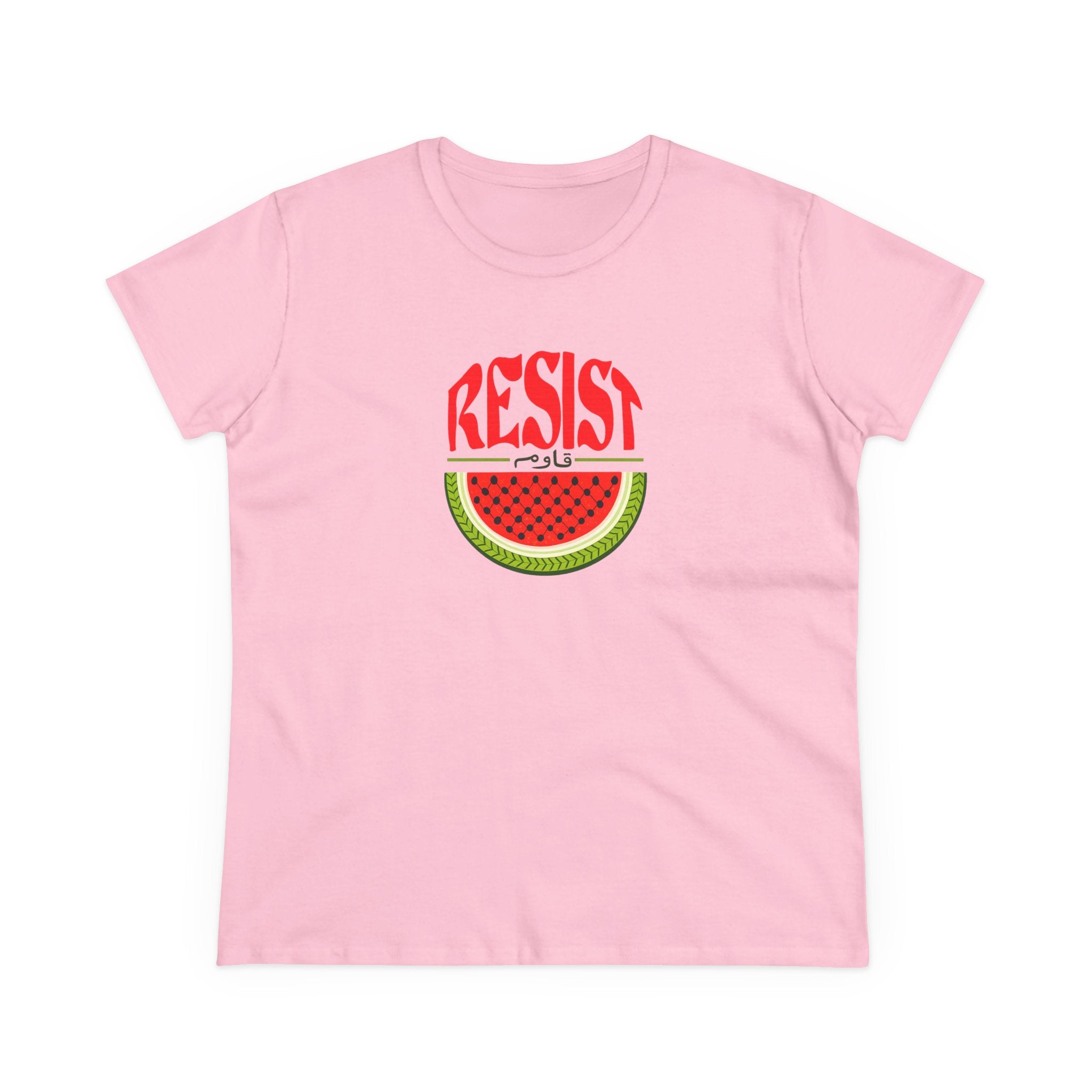 Make a bold statement of resistance and solidarity with our Women’s Watermelon Resist T-Shirt. Featuring a striking watermelon design with the word “RESIST” above it, this shirt symbolizes Palestinian resilience and identity. The watermelon has become a powerful cultural icon representing the Palestinian flag and freedom — making this tee both meaningful and stylish.